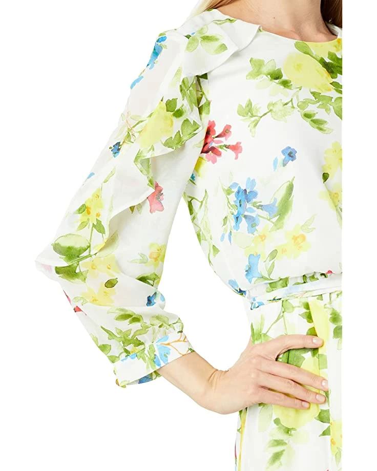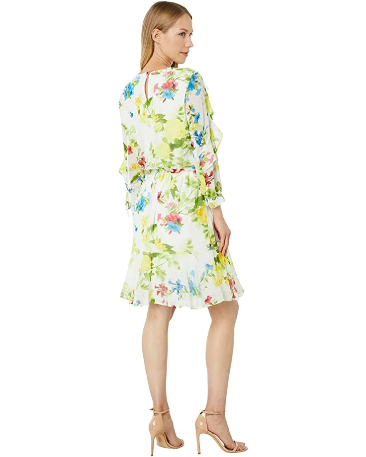- Calvin Klein® Printed Long Sleeve Dress with Ruffles and Belt.