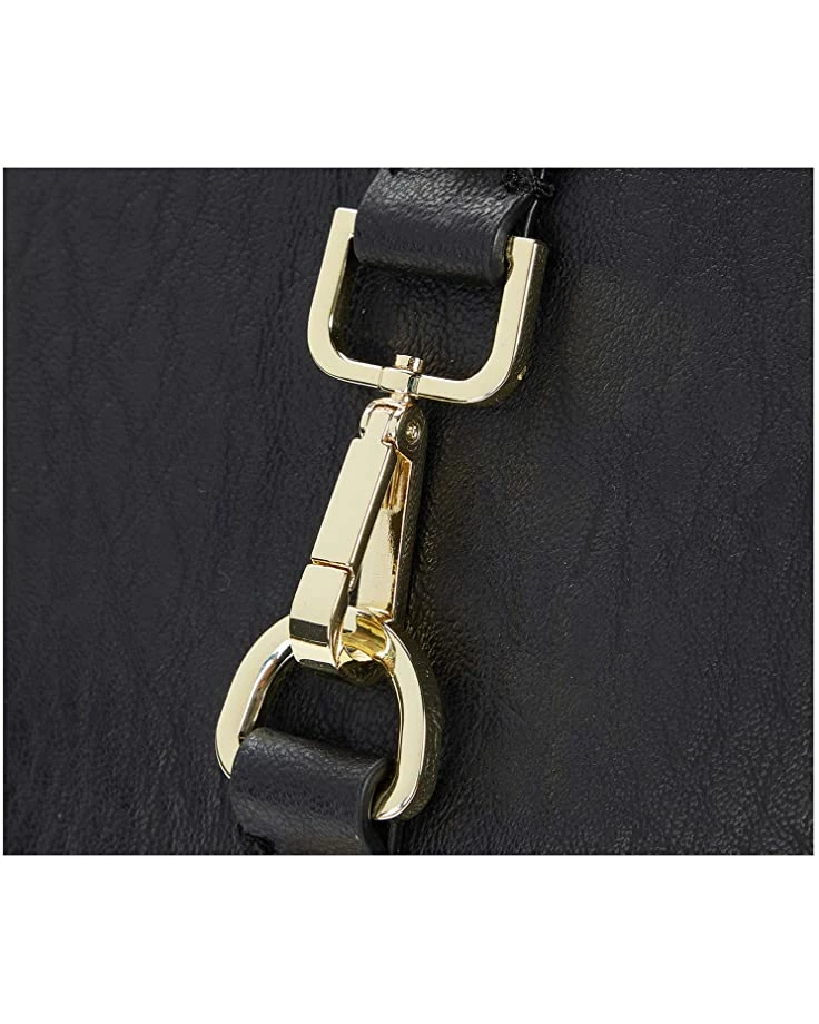 - Exterior boasts a zipper closure, adjustable shoulder strap, a slip pocket, metal decor, and brand detail.