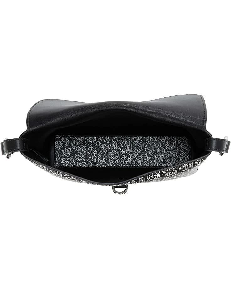 - Compact handbag with allover logo print features foldover flap with clip closure and adjustable carry strap.