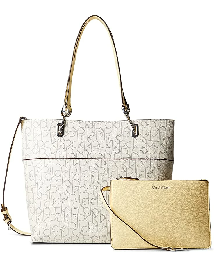 - The Calvin Klein® Key Item Signature Tote is a chic must-have handbag with embossed detail. The top zip closure construction fashion features interior pockets and 1 exterior snap pocket that completes this classic look.