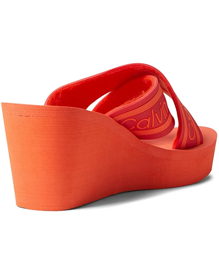- The Calvin Klein® Resort garners a wide fashion audience, whether it is spring or summer. The crisscross strap upper is decorated with logo prints and is set on a high wedge heel.