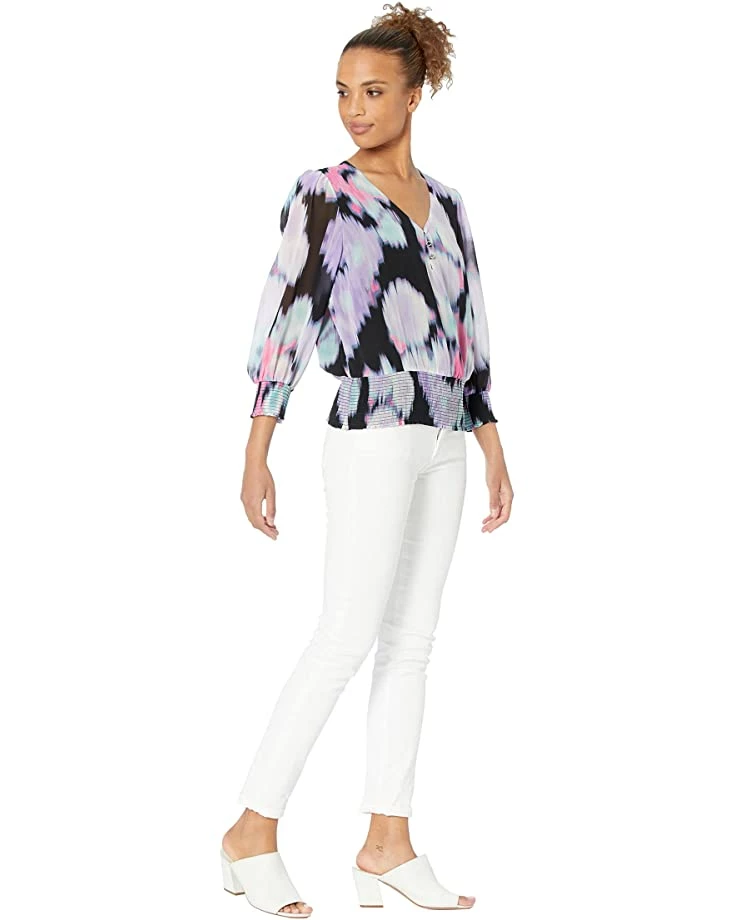 - Modern 3/4 blouson sleeves with smocked cuffs.
