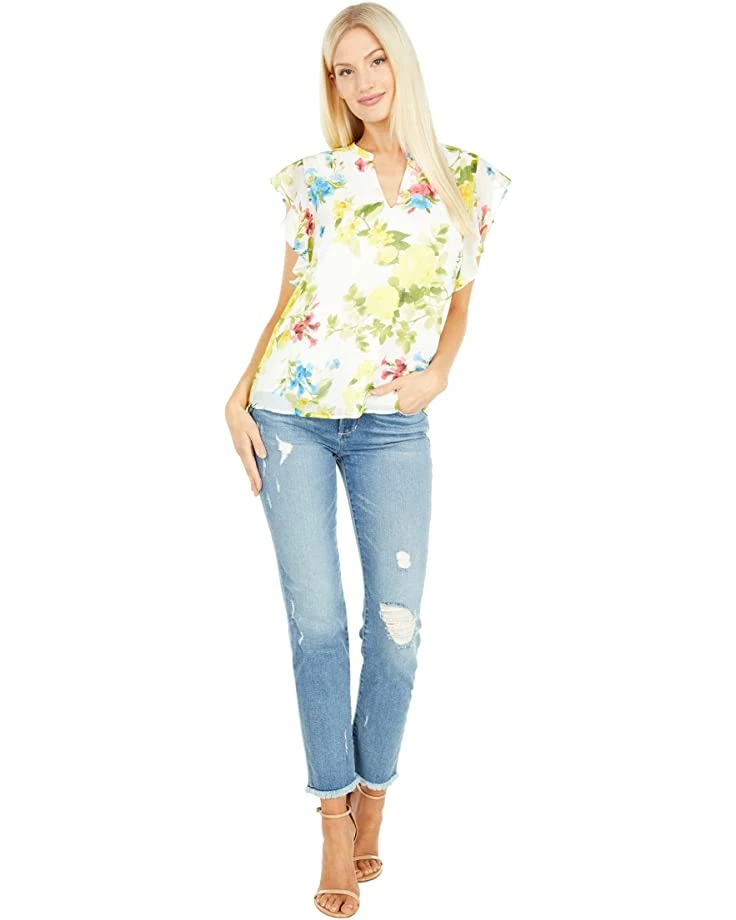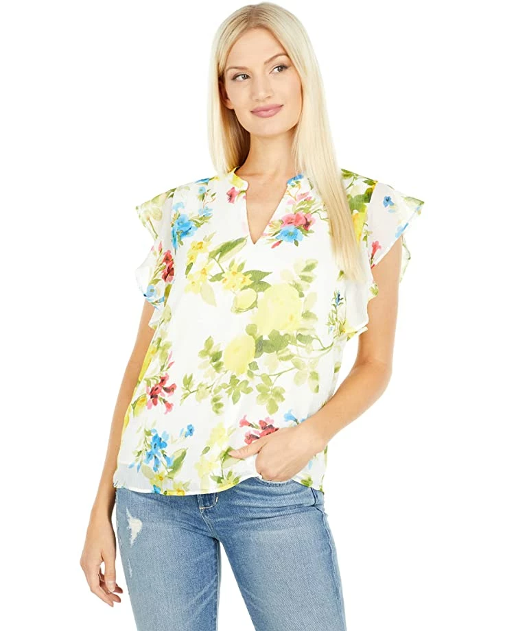 - The Calvin Klein® Printed V-Neck Blouse with Ruffle Sleeves.