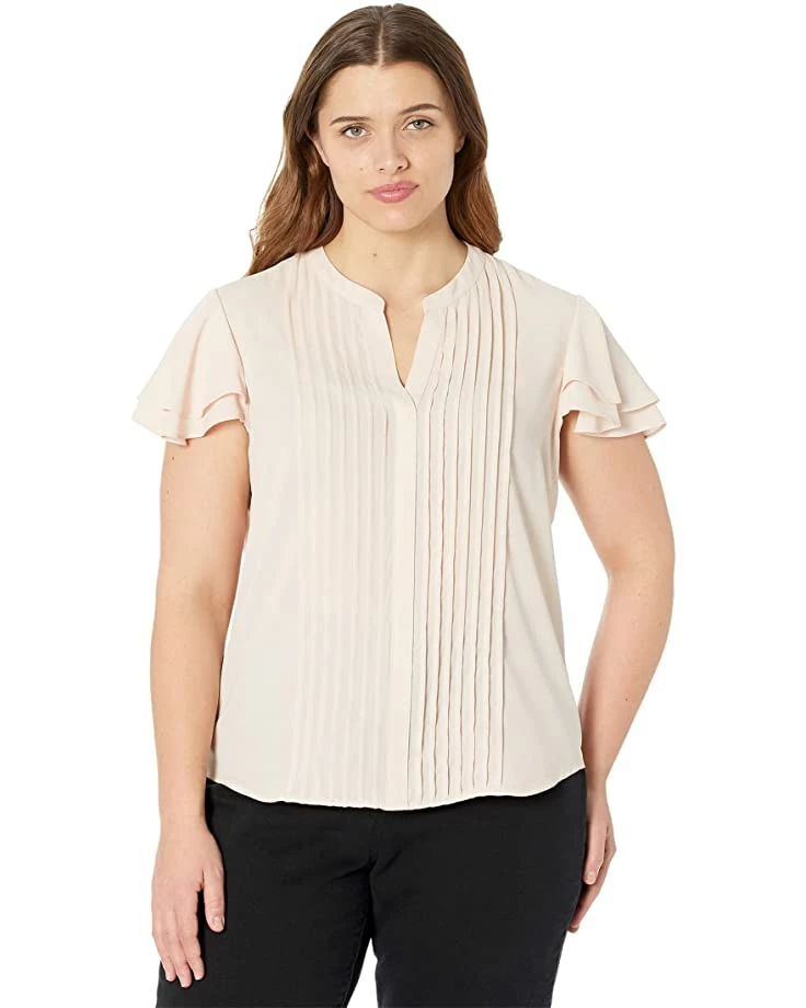 - Spice up your day-to-day look effortlessly wearing the Calvin Klein® Ruffle Cap Sleeve Pleat Front Blouse.