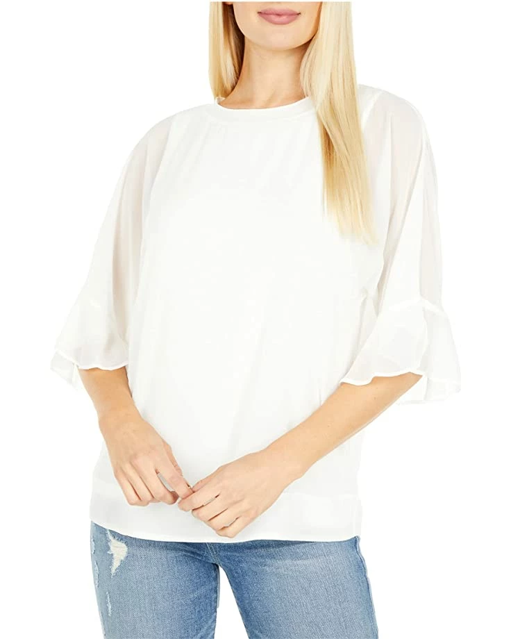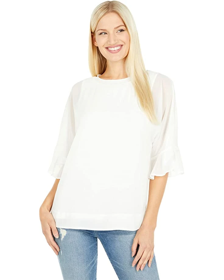 - Create a casual, polished look perfect for catching lunch with a friend wearing the Calvin Klein® Ruffle Sleeved Blouse with Knit Trim.