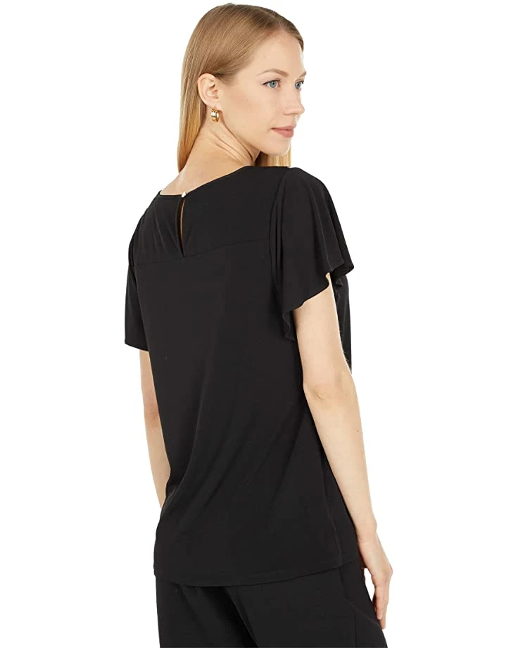 - Pullover top boasts a crew neckline and short flutter sleeves.